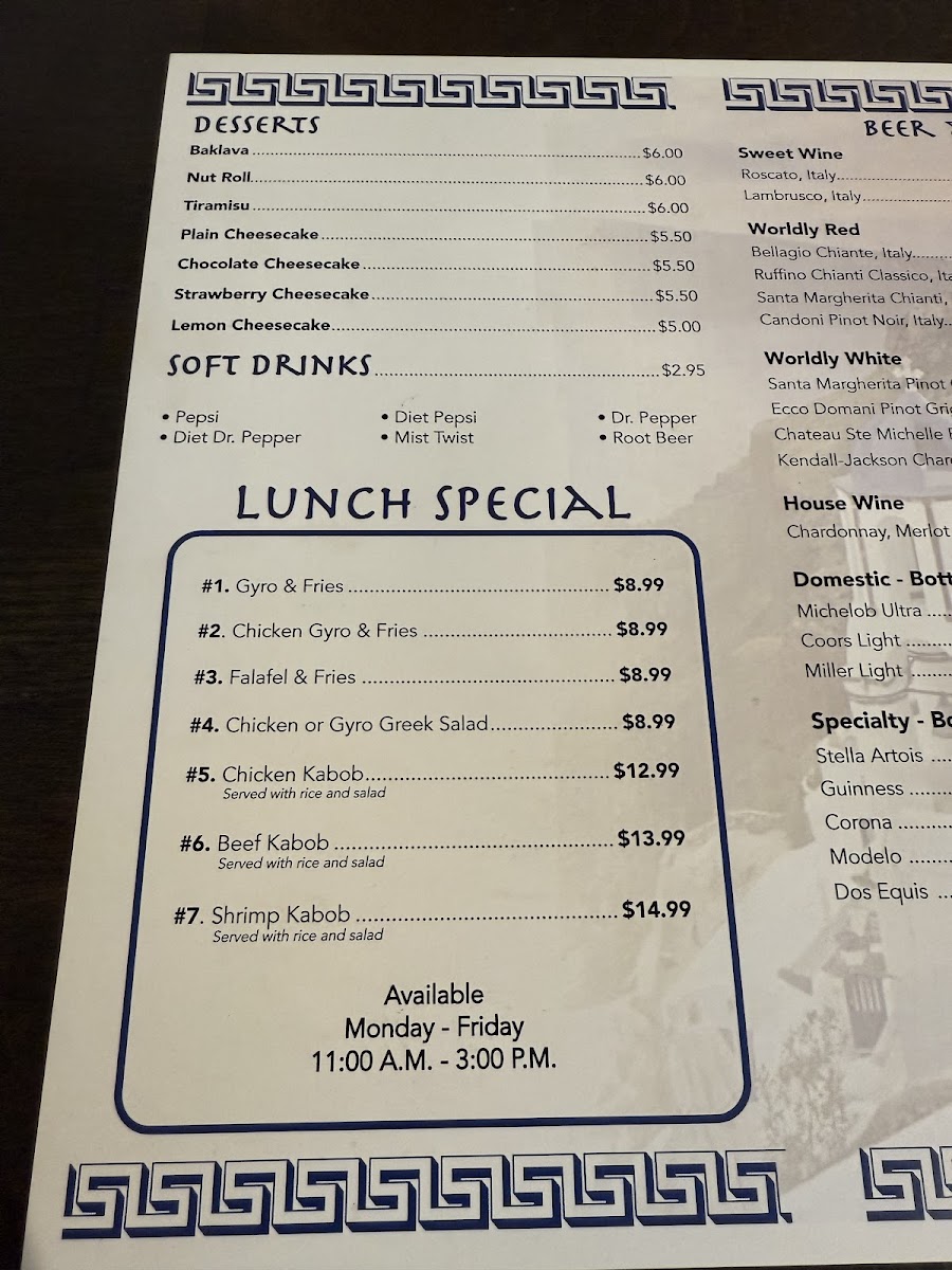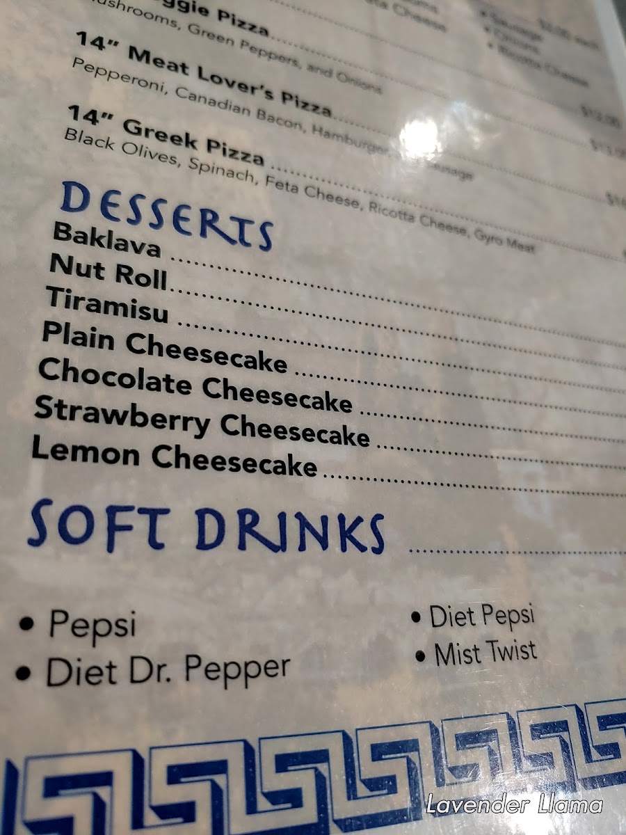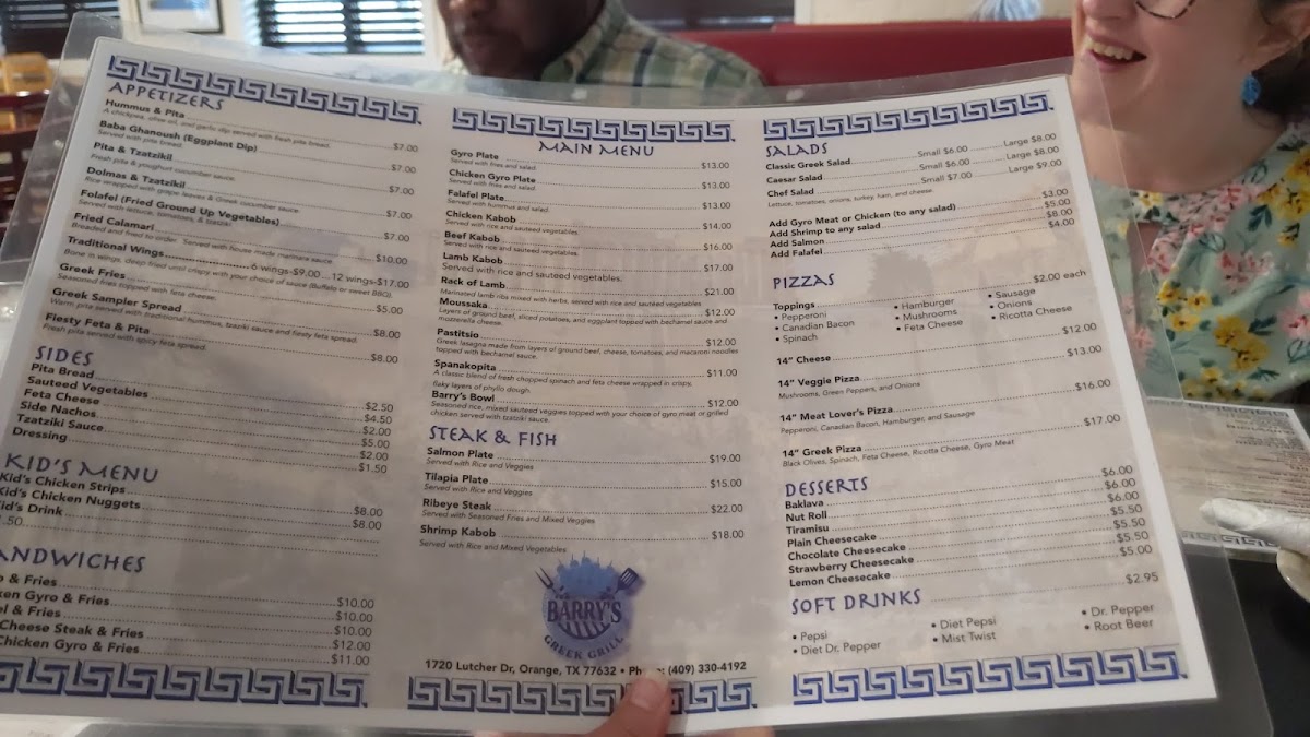 From a reviewer’s perspective, the menu at Barry’s Greek Grill, located at 1720 Lutcher Dr, Orange, TX 77632, offers a well-rounded and satisfying snapshot of Greek-inspired comfort food with something for every kind of diner. The experience begins with flavorful appetizers like Fiesty Feta & Pita, Baba Ganoush (Eggplant Dip), Pita & Tzatziki, Dolmas & Tzatziki, and Traditional Wings, which set the tone with bold Mediterranean flavors. For lighter options, salads such as the Chef Salad, Classic Greek Salad, and Caesar Salad provide fresh, balanced choices. The heart of the menu truly shines in the main offerings, where classics like Pastitsio, Spanakopita, Gyro Plate, Rack Of Lamb, and Lamb Kabob reflect authentic Greek comfort cooking. Sandwich lovers are well covered with hearty plates like Gyro & Fries, Chicken Gyro & Fries, Spicy Chicken Gyro & Fries, Falafel & Fries, and the indulgent Philly Cheese Steak & Fries. Seafood and steak fans will appreciate the variety found in Ribeye Steak, Tilapia Plate, Salmon Plate, and Shrimp Kabob, each adding depth to the menu. Families are not forgotten thanks to the kid-friendly Kid's Chicken Strips and Kid's Chicken Nuggets, while sides such as Small Tzatziki Sauce, Side Rice, Feta Cheese Dressing, and Small Feisty Feta allow diners to customize their meals. The pizza selection, including 14" Cheese, 14" Meat Lover's Pizza, 14" Greek Pizza, and 14" Veggie Pizza, adds a casual, crowd-pleasing element. To finish on a sweet note, desserts like Tiramisu, Lemon Cake, Strawberry Cheesecake, Plain Cheesecake, and Chocolate Cheesecake round out the meal perfectly. Paired with classic drinks such as Dr Pepper, Diet Dr Pepper, Sweet Tea, Unsweetened Tea, and Mist Twist, the menu as a whole feels complete, approachable, and thoughtfully curated, making Barry’s Greek Grill a reliable destination for both quick meals and relaxed dining.